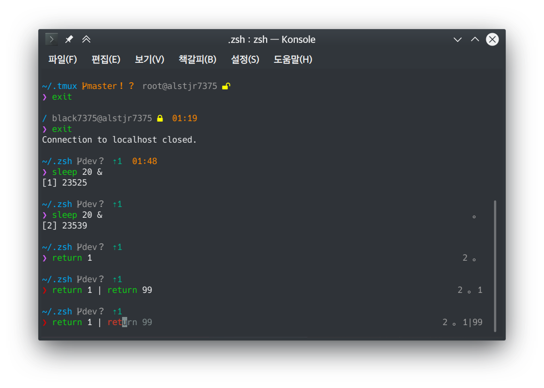 - 오른쪽: 결과 상태, 배경 작업, 명령 수행 시간, 내역, zsh 로딩 시간