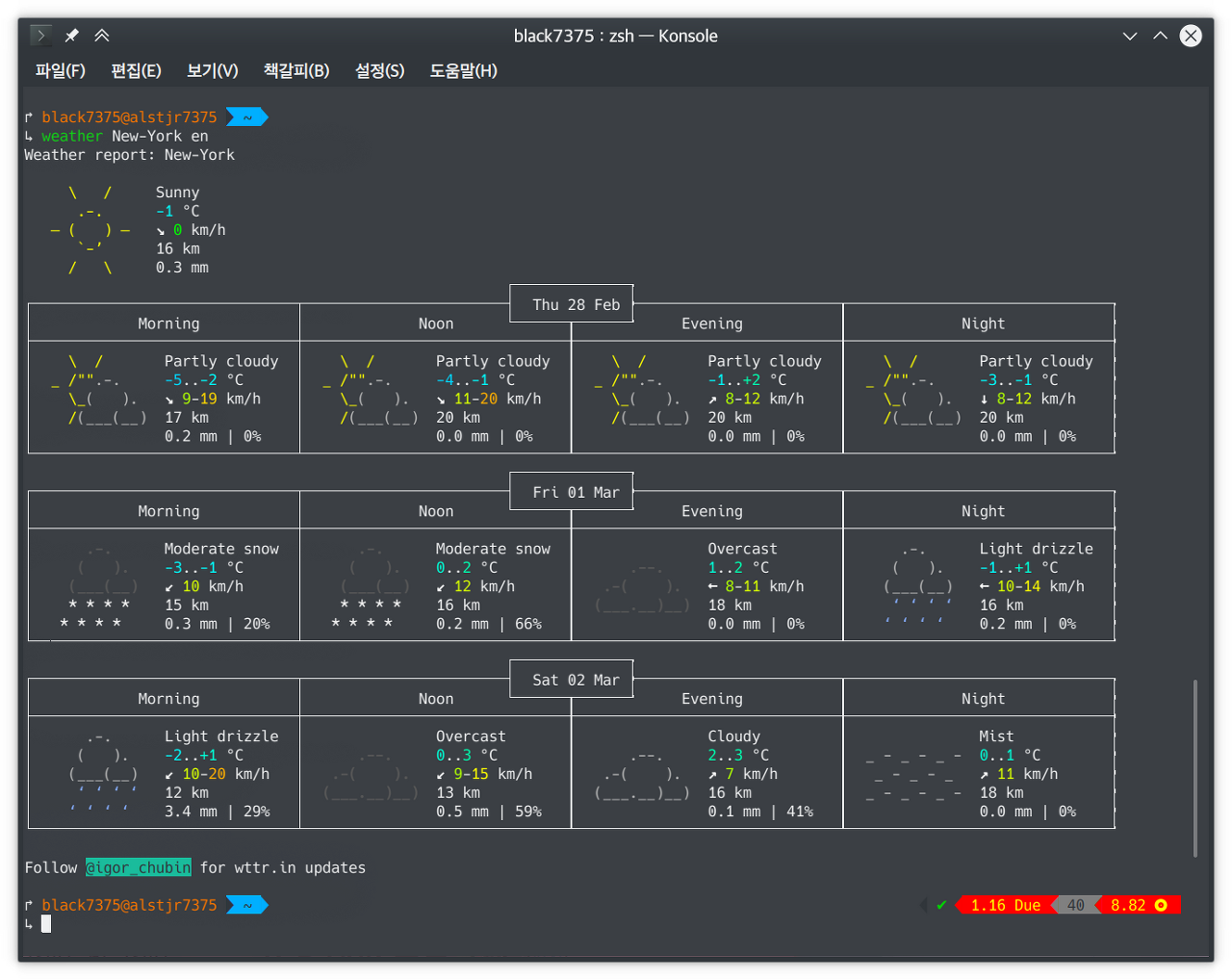 https://wttr.in/이라는 사이트에서 보여주는 내용을 터미널에서도 볼 수 있도록 하며, 자동으로 언어를 설정해주는 wrapper입니다.