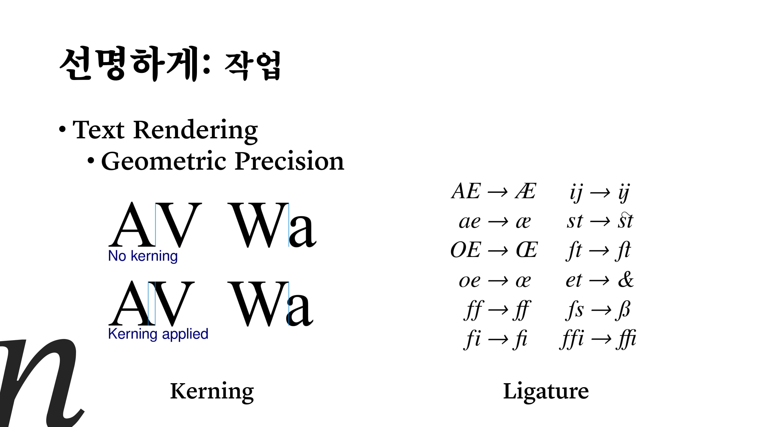 Kerning은 글자사이의 간격을 조정하여 가독성을 향상 시키는 것, Ligature은 합자를 만들어 가독성을 향상시키는 기법입니다. 보통 Ligature은 글씨가 작아 뭉쳐보일때 합쳐서 가독성이 향상시키는 것이 유리하며 약 20pt아래일때 적용이 되는 것으로 알고 있습니다.
