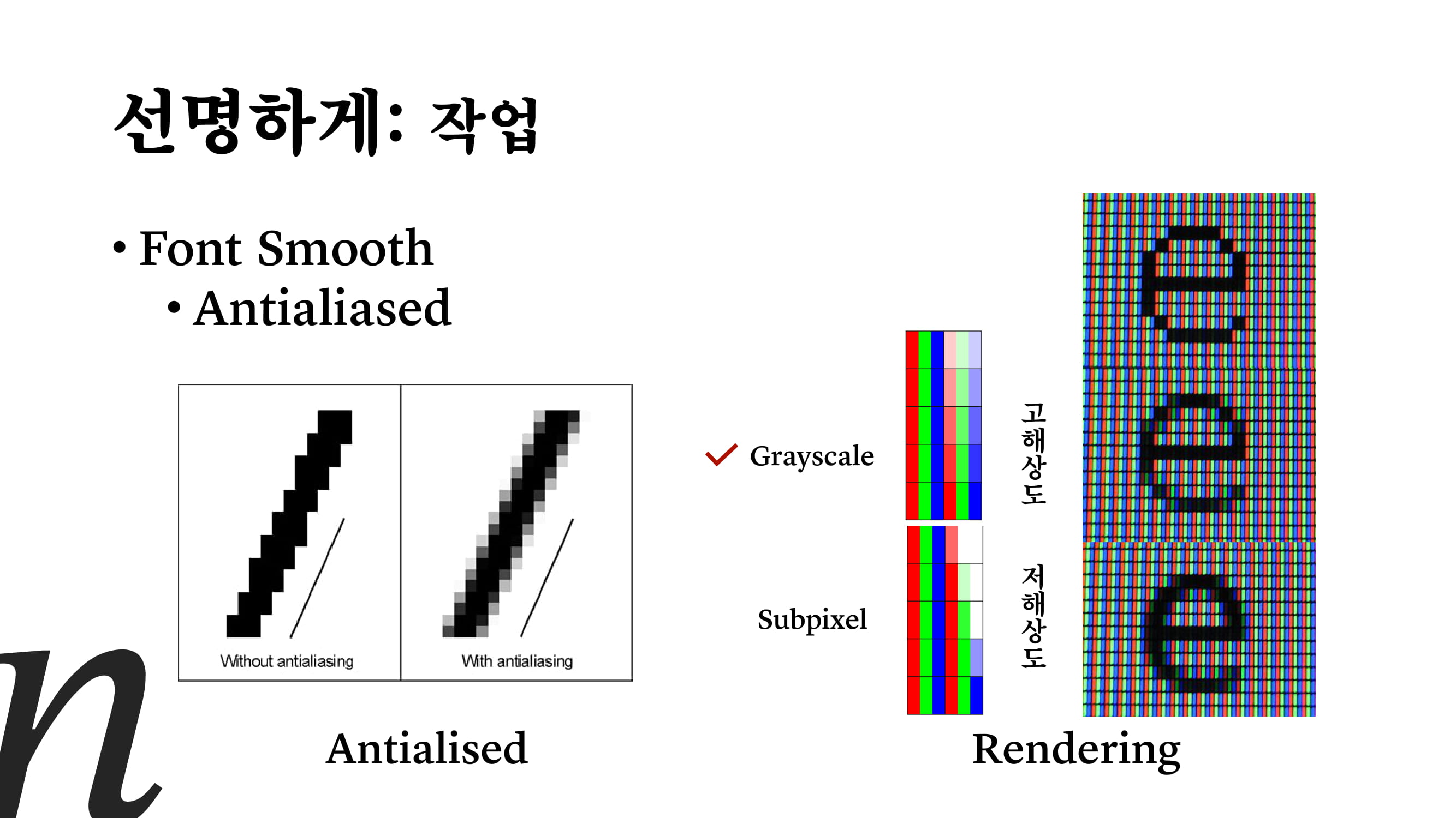 그레이스케일과 서브픽셀(클리어타입이라고도 불림)입니다.