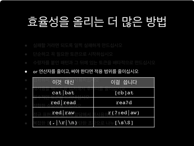 const re = /[a-zA-Z_0-9][A-Z_\da-z]*\e{1,}/; // Bad const re = /\w+e+/; // Good정규식을 분리시켜 불필요한 탐색이 반복되지 않도록 할 수 있다. (탐색 대상 축소)
