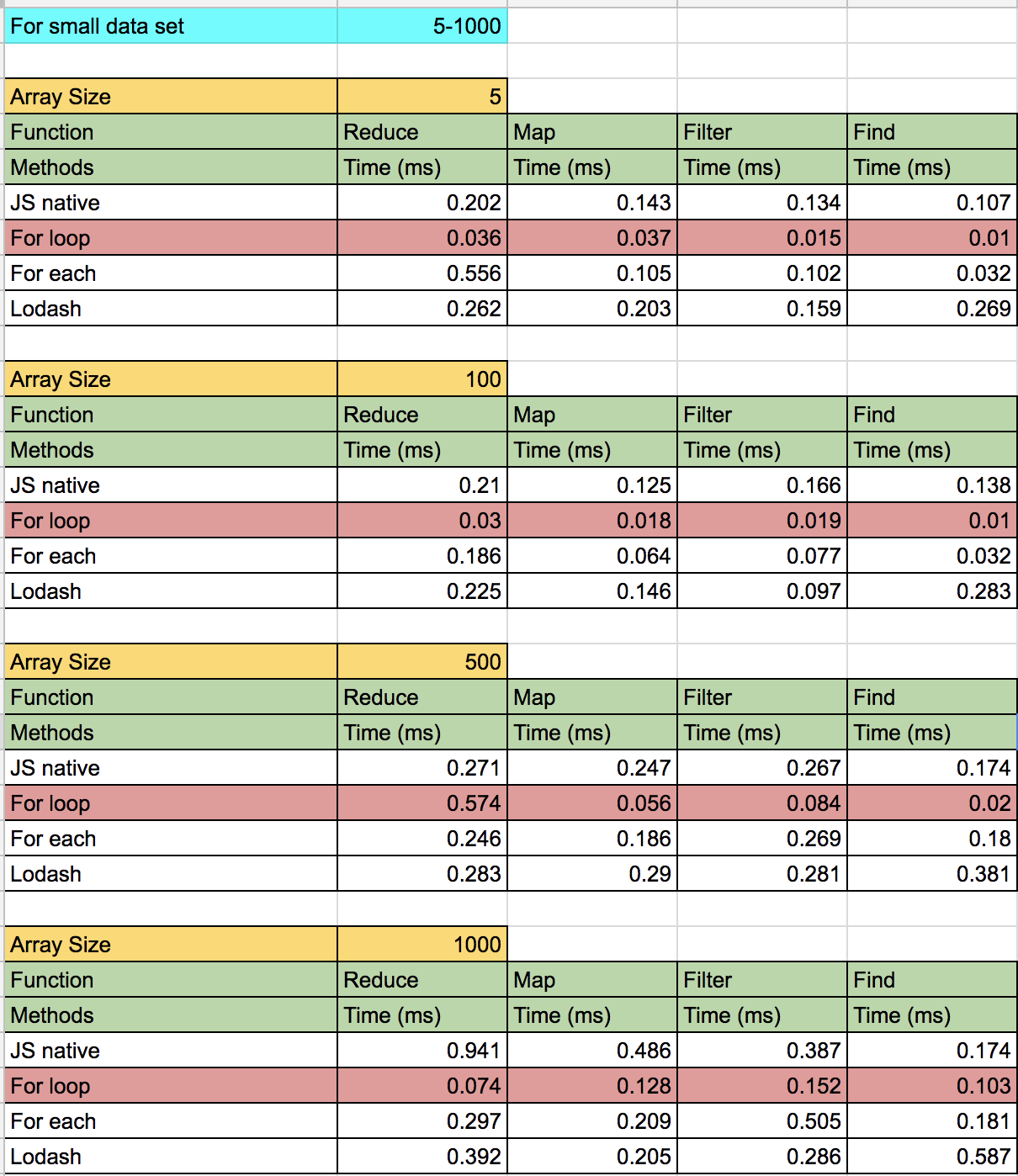 while >= for > for of > forEach(native) > forEach(loadsh) > each(underscore)