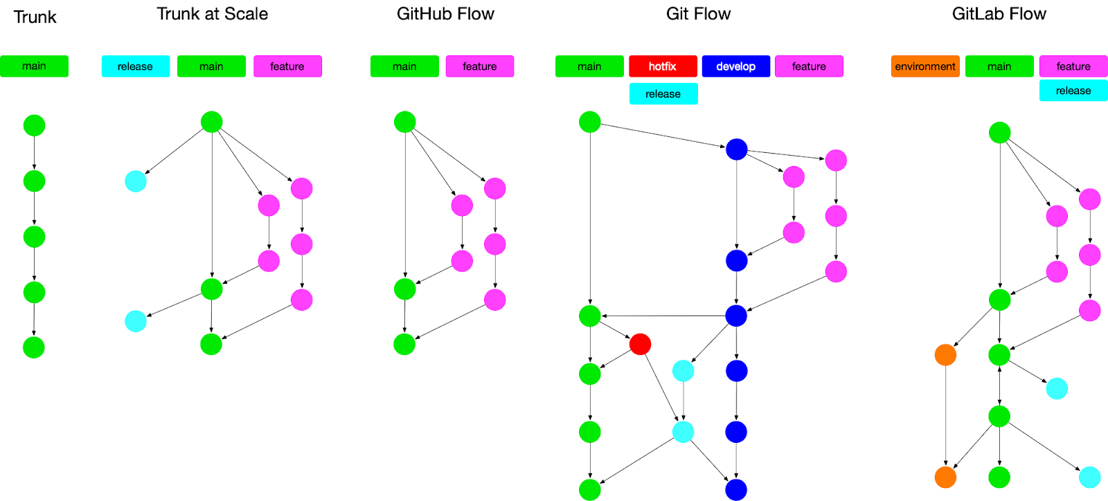 Staging 과정이 필요하면 Gitlab flow, 아니라면 Trunk 기반이 합리적으로 보인다.
