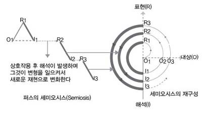 퍼스의 기호학은 표현체(Representamen), 해석체(Interpretant), 대상(Object)으로 이루어져 있습니다.